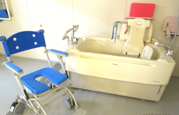 車椅子のままでも入れるチェアインバスを完備しております。ひとりひとりの状態に合わせて入浴して頂けるようになっています。