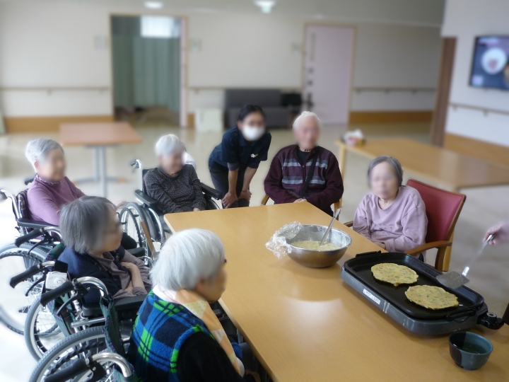利用者様には、ホットプレートで焼いていただきました!外はカリッと中はふんわりとした食感になりました☺